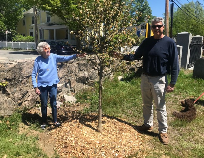Photo above: Joe Flanagan, Director of the Dedham DPW, and Marie Louise Kehoe, Chairman of the Dedham Village Preservation Assoc., Inc’s Friends of the Old Village Cemetery Committee, admire one of the new saplings, Crab Apple and Sugar Maple trees, planted along the Village Avenue abuttal. Shown in the background is Sisi, Marie Louise’s seven month old Australian Labradoodle pup, granted a 20 minute exemption by Joe from the OVC ban on dogs.