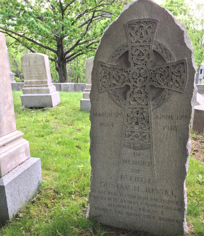 On a clear, crisp April 12, 1918 morning in France during the Great War, 1st Lieutenant Gustav Hermann Kissel of the 43rd Royal Air Force Squadron, an American Volunteer and graduate of Milton and Harvard, took off for his first combat mission and was shot down and killed when he encountered a large number of German fighter aircraft over Flanders. His Squadron was probably supporting British ground troops at the Battle of Lys, part of the ultimately unsuccessful German Spring offensive, General Erich Ludendorff’s, Operation Georgette, intended to capture Ypres. Lt. Kissel was buried in France, the only American to be buried in the Pont-du-Hem Military Cemetery in La Gorgue, but a cenotaph in his honor was placed in the Kissel plot here in Dedham’s Old Village Cemetery. The inscription reads: