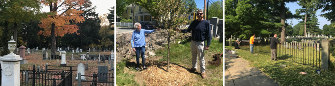 This Summer, thanks to your generous support, we will be able to begin restoring some of the individual plots that are especially at risk. The first on Joe’s schedule is the Howe plot abutting Village Avenue. Last year the two large Hemlocks which had overgrown the plot were removed in preparation for stonework, replicated and restored iron work, and landscaping. This Spring, we added a new line of trees along Village Avenue as part of creating a welcoming and peaceful experience for the hundreds of yearly visitors from all over the world who come in search of family history, as well as for local residents. At the bottom of the Cemetery, abutting Martin Bates St. is a naturally occurring vernal pool. If our budget permits, we are hoping to develop this area into a nature-fed “Rain Garden” that would add a reflective water feature to the serenity and verdancy that we are hoping to achieve as part of the Cemetery’s rebirth.