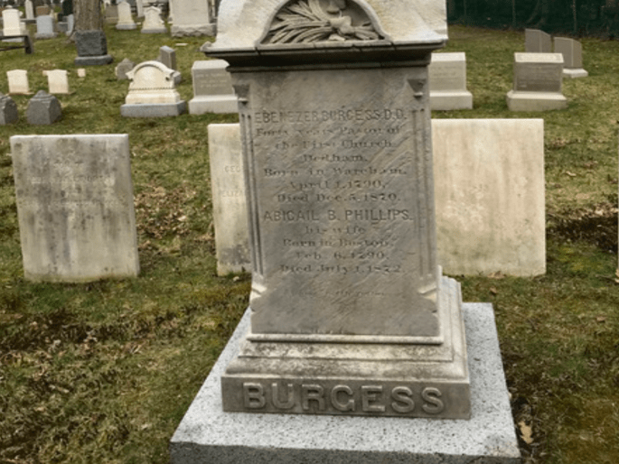 Ebenezer Burgess (1790-1870) is one of the many citizens of Dedham buried in the Old Village Cemetery who were an important part of shaping the Town’s history. He was born in Wareham, MA, graduated from Brown University in 1809, and received his doctorate in divinity from Middlebury College in 1835. Following a schism at the First Church and Parish, and the subsequent lawsuit (Baker vs. Fales), he was ordained pastor of the Allin Congregational Church in 1821. An adventurer and missionary, in 1817 he accompanied the Reverend Samuel J. Mills to Africa as an agent of the American Colonization Society and spent almost a year exploring the continent’s west coast. Mills died on the return journey and was buried at sea. Burgess was a founder of the Dedham Institution for Savings in 1831 and served as its President until his death in 1870. Dedham Savings is one of the oldest banks in America and is still doing business under its original charter, to wit, “to provide a safe and profitable mode of enabling industrious persons of all descriptions to invest such part of their earnings as they can conveniently spare”. In 1832, one year after its founding, the bank’s assets were $30,000, compared to $1.736 billion in 2020.