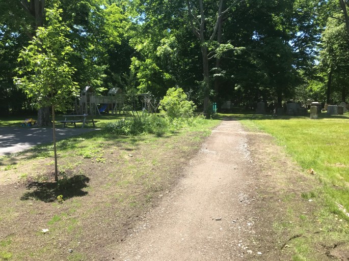 In cooperation with the Town of Dedham DPW, and its Director, Joe Flanagan, the DVPA, Inc. has planted four Sugar Maple saplings adjacent to St. Paul’s new children’s play area and cleared a path to give the children safe access. Reverend Melanie McCarley, Rector of St. Paul’s, writes: “St. Paul’s Episcopal Church is grateful for the assistance of The Dedham Village Preservation Association in planning and constructing a walkway for the safety of our children to move from the church building to their new playground.  Prior to the installation of the walkway children would make their way behind cars through the parking lot; a hazardous undertaking to a place of play.  The Dedham Village Preservation Association and the Dedham DPW made this pathway possible by removing overgrown areas as well as a fence, gifting a small portion of land and constructing the walkway.  We are deeply appreciative of their efforts.”