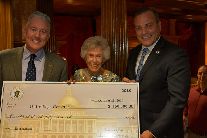 I want to thank the more than 200 guests who attended the Gravedigger’s Gala on Friday night at the Endicott Estate to benefit the renovation of the Old Village cemetery. I had a wonderful time, and it looked as if everybody else did too, and that was our objective during the many months of planning that went into the event. I am so grateful to the gala Committee for the hard work and dedication that they unselfishly gave on behalf of a cause that has been close to my heart for many years. To Co-chairs Darcy Lane and Maureen Joyce, thank you for your inspired leadership, and to Jonathon Briggs, Anne Cadigan, Nancy Clement, Tracy Driscoll, Joe Flanagan, Michele Heffernan, Mary Louise Kehoe, Jeannine Lathum, Johanna McBrien, Glenn McGibbon, and Ted Russell, thank you for the many talents that you contributed to the planning of an evening of hair-raising good fun. A special thanks to Jim Bride for his tantalizing video promos at the Community Theater that brought the Gravedigger’s Ghost to life after death, and, of course, to Dedham DPW Director, Joe Flanagan, who has been charged with the daunting task of resurrecting the dead, and whose hard work has made this three-year project possible. Joe’s steady hand has guided the work from the beginning, and is everywhere in evidence throughout the Cemetery, from the handsome Village Avenue entrances, to the newly repaired monuments and headstones. And, I am so grateful to the Dedham Visionary Access Corporation, community TV at its best, Executive Director, Donna Greer, and her creative staff, Brian, Dennis, and George, for their coverage prior to, and during, the Gala.