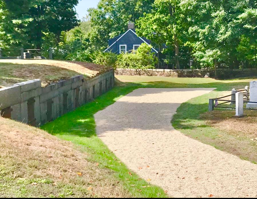 Lots of improvements have taken place in the Cemetery as the restoration moves ahead under the direction of Joe Flanagan, Director of the Dedham DPW, and the Dedham Village Preservation Association, Inc. The ironwork of the Howe plot (AX132 on the Town map of the Cemetery) has been replicated and installed by Wovensteel, Inc., of East Boston, manufacturer of distinctive ironwork. The Howe plot was the most seriously distressed grave in the OVC, involving the removal of invasive trees, foundation issues, and the repair and replication of ironwork. The work was paid for in part by a generous grant from the Dedham Savings Community Foundation.